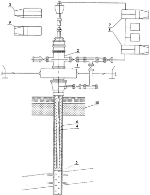 Затем колонну заливочных труб 4 снова приподнимают над цементным мостом 5 и через них заполняют ствол скважины и интервал многолетнемерзлых пород 10 газовым конденсатом, что обеспечивает одинаковую плотность раствора в стволе скважины и предотвращает его расслоение.