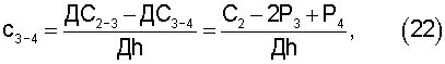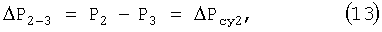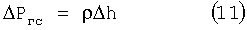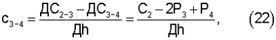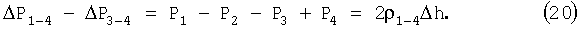 В то же время на вертикально расположенных стеклопластиковых трубах 1 и 2 на разницу давлений до сужающих устройств 8 и 10 и после них него будет влиять и составляющая гидростатического давления. Разность давления Ргс между точками измерения давления Р1 и Р2 (датчиками 18 и 19) и Р3 и Р4 (датчиками 20 и 21) (см. фиг.2):