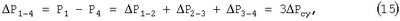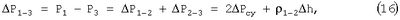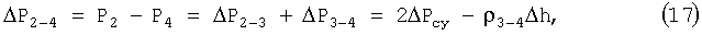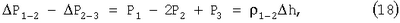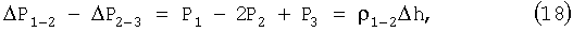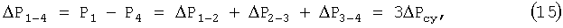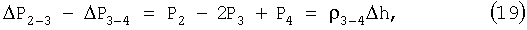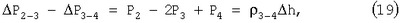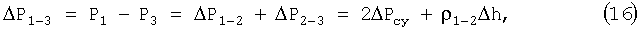 Пренебрегая потерями на трение, которые на горизонтальной ветви незначительны, а на восходящей и нисходящей ветвях скомпенсированы, и учитывая, что в силу неразрывности газожидкостного потока при его неизменной плотности, скорости потока в сужающих устройствах 8, 9, 10 равны между собой, в результате чего равны и перепады давления в сужающих устройствах Рсу. Оперируя значениями давлений P1, Р2, Р3, р4 в точках измерения и перепадами давлений между ними, получим ряд уравнений, которые выглядят следующим образом: