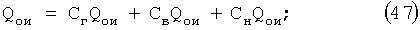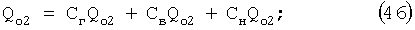 Объемные расходы газа, нефти, воды определяются из условия, что объемный расход газожидкостной смеси Qo2 через сужающее устройство 9 и объемный интегральный расход Qон через три сужающих устройства 8, 9, 10, определяемые по выражениям (26, 30), равен сумме расходов компонентов смеси по их доле в объеме смеси: