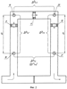 Устройство для измерения покомпонентного расхода трехкомпонентного газожидкостного потока, представленное на фиг.1, выполнено в виде симметричной конструкции, состоящей из двух вертикально и параллельно расположенных труб 1 и 2, выполненных из высокопрочного радиопрозрачного материала (например, из стеклопластика) с металлическими законцовками 3, заканчивающимися фланцами 4. Верхние части вертикально расположенных труб 1 и 2 соединены верхней горизонтальной металлической трубой 5 с вертикально расположенными фланцевыми соединительными отводами 6 и 7. Во фланцевых соединительных отводах 6 и 7 и в середине горизонтальной металлической трубы 5 расположены три сменных сужающих устройства 8, 9, 10, представляющих собой шайбы, диаметр проходного отверстия которых в 2-4 раза меньше внутреннего диаметра вертикально расположенных стеклопластиковых труб 1, 2. Нижние части вертикально расположенных стеклопластиковых труб 1, 2 соединены с вертикально расположенными фланцевыми соединительными отводами 11, 12 нижней горизонтальной металлической трубы 13. На концах нижней горизонтальной металлической трубы 13 расположены фланцевые соединения 14, предназначенные для встраивания ее в основной трубопровод. В середине нижней горизонтальной металлической трубы 13 и на вертикально расположенных фланцевых соединительных отводах 11, 12 расположены запорные шаровые краны 15, 16, 17. На нижних металлических законцовках 3 вертикально расположенных стеклопластиковых труб 1, 2 и на противоположных им частях верхней горизонтальной металлической трубы 5 симметрично расположены четыре датчика 18, 19, 20, 21, предназначенные для измерения как давления, так и температуры в потоке газожидкостной смеси. Для осуществления указанных функций датчики 18, 19, 20, 21 могут быть выполнены в виде кварцевых преобразователей давления и температуры, например преобразователя ПДТК-4,0-МР производства ООО «СКТБ ЭлПА», г.Углич. Примерное расстояние между датчиками 18-19 и 20-21 по вертикали составляет около 1 м, между датчиками 19-20 по горизонтали – 0,6 м. На вертикально расположенных стеклопластиковых трубах 1 и 2 симметрично расположены два гамма-плотномера, каждый из которых содержит источник 22, 23 ионизирующего гамма-излучения и по два детектора 24, 26 и 25, 27 гамма-излучения соответственно, образующие малые и большие зонды гамма-плотномеров, и два электромагнитных зонда 28 и 29 проводимости и диэлектрической проницаемости. Электромагнитные зонды 28 и 29 проводимости и диэлектрической проницаемости выполнены в виде индуктивных катушек, размещенных на внешней поверхности вертикально расположенных труб 1 и 2.