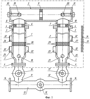 На верхней горизонтальной металлической трубе 5 симметрично установлены в левом торце – компенсационный детектор 30 фоновой гамма-активности, а в правом торце – зонд 31 окислительно-восстановительного потенциала, содержащий платиновый электрод и электрод сравнения (не показано). Конструкция устройства симметрична геометрически и уравновешена гидравлически. Источники 22, 23 гамма-излучения выполнены в виде контейнеров объемом около 7,5 л с засыпкой в них KCl, безопасного для обслуживающего персонала. В качестве детекторов 24, 25, 26, 27 гамма-излучения и компенсационного детектора 30 фоновой гамма-активности использованы сцинтиляционные кристаллы NaJ(Tl) или ZsJ с фотоэлектронными умножителями (ФЭУ). С целью устранения влияния космического фона детекторы 24, 25, 26, 27 закрыты с внешней стороны защитными экранами 32 из освинцованной резины. Датчики 18, 19, 20, 21, детекторы 24, 25, 26, 27 гамма-излучения малых и больших зондов гамма-плотномеров, электромагнитные зонды 28 и 29 проводимости и диэлектрической проницаемости, компенсационный детектор 30 гамма-активности и зонд 31 окислительно-восстановительного потенциала соединены с введенными в устройство блоком электроники, вычислительным устройством, блоком энергонезависимой памяти и аккумуляторным блоком аварийного питания (не показано). Все измерительное устройство закрыто защитным кожухом 33 с теплоизоляцией 34, внутренние стенки устройства имеют защитное покрытие (не показано) для предотвращения нарастания на внутренней поверхности асфальто-смолистых и парафиновых отложений.