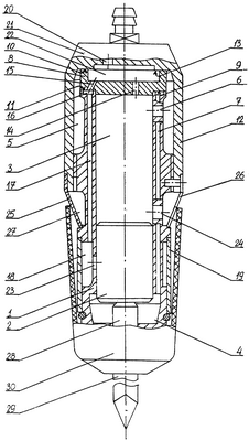 По мере совершения ударником рабочего хода давление воздуха в камере 4 и сообщенной с ней посредством канала форсажа 23 камере 18 будет увеличиваться. При последующем перекрытии ударником 2 канала форсажа 23 давление воздуха в камере 18 будет интенсивно повышаться до уровня сетевого, благодаря его непрерывному поступлению в камеру через впускной дроссельный канал 15, проточку 16, канал 17 из сетевой камеры 22. Повышенное давление воздуха в камере 18 не сказывается на повышении противодавления в камере 4, поскольку они разобщены и противодавление в камере 4 будет характеризоваться только давлением воздуха, поступившего в нее посредством канала 15, проточки 16 и канала 7 запуска. Под действием разницы импульсов давлений в камерах 3 и 4 ударник 2 наносит удар по хвостовику 28 инструмента 29 и описанный рабочий процесс будет повторяться с той разницей, что холостой ход ударника будет формироваться также при участии импульса отскока ударника от хвостовика инструмента.