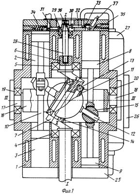 на фиг.1 показан аксиально-поршневой двигатель, общий вид в продольном разрезе;