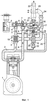 При этом на режимах холостого хода и малых нагрузок в цилиндр рециркулирует часть отработавших газов, направляемая помимо турбины в процессе байпасного регулирования. С увеличением нагрузки дизеля, когда рециркуляция отработавших газов в цилиндр становится экономически нецелесообразной, эта часть потока отработавших газов выбрасывается в атмосферу. Последнее является существенным недостатком рассматриваемого способа и устройства для его осуществления. Энергия части потока отработавших газов, выбрасываемой в атмосферу, еще достаточна высока, но в этом случае полезно не используется при работе дизеля на режимах средних и номинальных нагрузок. Недостатком рассмотренного устройства является также пониженная работоспособность возвратной пружины, расположенной в горячей зоне золотникового механизма со стороны подвода отработавших газов.