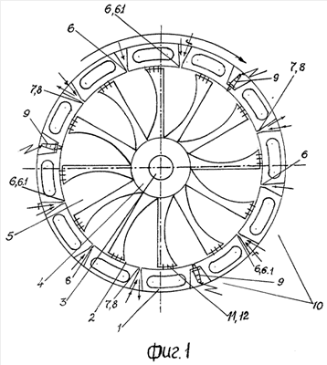 “Вариант 1”. Роторный секторный двигатель типа фиг.1 и 2. На корпусе-статоре 1 выполнено девять впускных каналов – шесть для подачи одной части компонентов топлива 6, три – для подачи других компонентов горючего 6.1, три свечи зажигания 9, три выпускных 7 и три продувочных 8 канала, то есть в каждом основном секторе в одном заполняющем секторе выполнено по одному впускному 6 каналу, в другом заполняющем секторе – по одному впускному 6 и еще по одному дополнительному впускному каналу 6.1. По впускным 6 каналам подается один компонент топлива, по другому впускному 6.1 каналу подается другой компонент. В следующем заполняющем секторе установлена свеча зажигания 9, в последующем выполнены по одному выпускному каналу 7 с одним продувочным каналом 8, на диске ротора 4 выполнены элементы двенадцати камер сгорания 5.