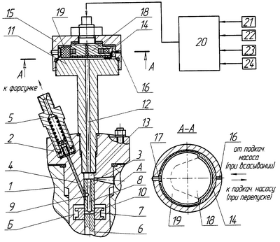 Топливная система состоит из нагнетательной секции насоса, установленной в корпус 1, включающей втулку 2, снабженную впускным каналом 3, сообщающимся с полостью А и нагнетательным 4 каналом; штуцер 5 (на схеме условно изображен только один штуцер); плунжер 6, имеющий радиальный 7 и осевой 8 каналы, соединенные с распределительным пазом 9; дозатор 10; штуцер 11, осевой канал 12 которого соединен с надплунжерным пространством 13; перепускной кольцевой клапан 14 с гнездом 15 с перепускным каналом 16; шпонку 17; электромагнит 18, покрытый диэлектрическим материалом 19; электронный контроллер-регулятор 20 и датчики положения педали управления подачей топлива 21, частоты вращения двигателя 22, объема поступающего в цилиндры воздуха 23 и положения поршня 24.
