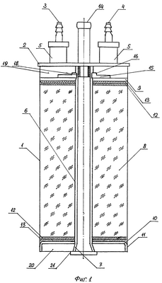 При неработающем двигателе адсорбер работает в режиме адсорбции. В результате избыточного давления в бензобаке БВС через входной патрубок 3 поступает в сборник конденсата 5, который закреплен на крышке 2, проходит во входную полость 19, где равномерно распределяется по сечению верхней перфорированной решетки 9, проходит последовательно через отверстия 24, слой поролона 12, слой фильтрующего материала с армирующей сеткой 13, слои зерненого активного угля 8, затем последовательно нижний слой фильтрующего материала с армирующей сеткой 13 и слой поролона 12, нижнюю перфорированную решетку 10 и поступает уже освобожденной от паров бензина, который поглотился в слое активного угля 8, в выходную полость 20, образованную бортиком 11, и между зазорами распоров 7 очищенный воздух направляется во входной конец подающей трубки 6, проходит ее снизу вверх и через патрубок соединения с атмосферой 14 удаляется.