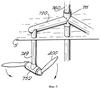 На фиг.1 и 2 показана электростанция, состоящая из трех узловых элементов 700, собранных с помощью соответствующего количества соединительных элементов 740. Электростанция, таким образом, имеет конфигурацию равностороннего треугольника с одной несущей опорой 760 в каждом углу. Конструкция такого вида является предпочтительной, поскольку при этом обеспечивается статическая установка электростанции, когда она загружена балластом и прижата к дну.