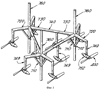 Генераторные блоки 750 генераторов установлены на, по существу, вертикальных несущих элементах 749, каждый из которых может быть закреплен на горизонтальном несущем элементе 720 или промежуточных соединительных элементах 740.