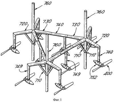 Основной аспект настоящего изобретения состоит в том, что электростанция может быть установлена на дне В с помощью несущих опор 760. Они установлены с возможностью перемещения посредством муфт 711, 712, так, что при использовании таких несущих опор электростанция может быть избирательно установлена на выбранной высоте в массе воды. Принцип “подъемника” такого типа хорошо известен, но не в связи с конструкцией установок, охватываемых настоящей заявкой. Благодаря возможности регулировать высоту установки в воде, генераторы можно легко поднимать над поверхностью воды для технического обслуживания, ремонта или замены. Кроме того, расположение генераторов в массе воды может быть оптимизировано по отношению к условиям потока и топографии дна. Благодаря использованию регулируемых несущих опор, в соответствии с настоящим изобретением, электростанцию такого типа легко можно установить на очень неровном дне.