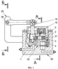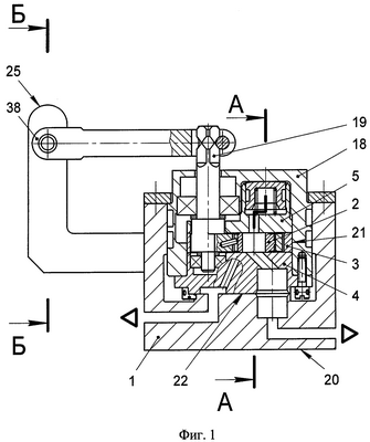 – на фиг.3 показан разрез Б-Б на фиг.1, общий вид, разрез регулирующего устройства – механизма бесступенчатой коррекции и визуального контроля 25 микроперемещений рычага-привода 38 и, соответственно, управляющего вала 19 гидрораспределителя 18 (см. фиг.1).
