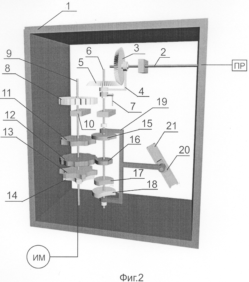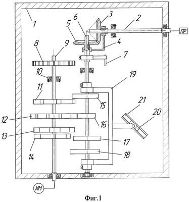 Регулируемый мальтийский механизм работает следующим образом. Перемещением ползуна 20 в пазу 21 устанавливается положение поводка 7 относительно мальтийского креста 8, определяющие угол поворота последнего, при этом вал 6 перемещается по горизонтали, перемещая шестерню 3 вдоль вала 2, и вертикали, вводя во взаимодействие одну из пар запирающих дисков 11-15, 12-16, 13-17, 14-18. После этого на вал 2 передается вращение от привода, которое через зубчатую передачу 3-5 передается валу 6. Поводок 7, сидящий на ступице шестерни 5, начинает поворачиваться, заходит в один из пазов мальтийского креста 8 и поворачивается вместе с ним. После того, как поводок 7 выйдет из паза мальтийского креста 8, повернув его на установленный угол, диски (15, 16, 17, 18), установленные на валу 6, продолжают поворачиваться, при этом своим профилем останавливают вращение соответствующих дисков (11, 12, 13, 14) на валу 9, останавливая вал. Поводок 7, поворачиваясь вокруг вала 6, вновь входит в паз мальтийского креста 8, и все повторяется.