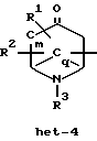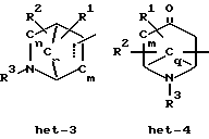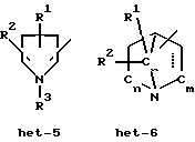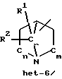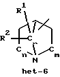 Препаративная форма 1Типичные таблетки, подходящие для использования в данном способе, могут приготовляться с использованием общепринятых приемов и могут содержать ингредиенты, представленные в табл.3. Препаративная форма 2 Твердые желатиновые капсулы приготавливаются с использованием ингредиентов, данных в табл. 4. Указанные ингредиенты смешиваются и ими заполняются твердые желатиновые капсулы в количестве 210,1 мг. Препаративная форма 3 Следующими являются суспензии, каждая содержащая 1 мг медикаментов на 5 мл дозу (см.табл. 5). Медикамент пропускается через сито размером 45 меш США и смешивается с натриевой карбоксиметилцеллюлозой и сиропом с образованием однородной пасты. Раствор бензойной кислоты, вкусовой и красящий агент разбавляется некоторым количеством воды и добавляется к пасте с перемешиванием. Затем добавляется достаточное количество воды до получения требуемого объема. Промежуточные продукты и способы настоящего изобретения являются полезными для получения соединений, имеющих благоприятную активность мускариновых рецепторов. Соединения настоящего изобретения обладают такой полезной активностью мускариновых рецепторов. Некоторые соединения и условия, охватываемые объемом данного изобретения, предпочитаются. Для получения предпочтительных соединений и создания условий процесса могут комбинироваться независимо следующие ниже условия, воплощения изобретения и соединения с характеристиками, перечисленными в табличной форме. Следующий ниже перечень воплощения данного изобретения не предназначен для ограничения каким-либо образом объема данного изобретения. Некоторыми предпочтительными характеристиками соединения формулы I являются следующие: A/ W представляет 0, B/ r представляет 1 или 2, C/ G выбран из het-1 и het-5, D/ G является ненасыщенным, E/ G представляет het-4, F/ G представляет азабицикл, имеющий 7 кольцевых атомов углерода и атом азота, G/ G представляет het-6, H/ r представляет 0, 1/ R выбран из галогена, -OR5Y, -SR5Y, -OR5ZY, -SR5ZY, -OR5ZR4, -SR5ZR4, -OR4 и -SR4, J/ W представляет серу, K/ m представляет 1, L/ n представляет 1, M/ p представляет 2, N/ v представляет 0 или S, O/ G представляет het-2, P/ G представляет выбор из следующих гетероциклов: ![]() ![]() ![]() ![]() ![]() где точка присоединения к -/CH2/r-W-группе является такой, как указана, Q/ G группа выбрана из группы, состоящей из ![]() ![]() ![]() ![]() R/ G не является азабициклом, S/ G представляет het-3, T/ R не является группой OR4, в которой R4 представляет (1-3)C-алкил, U/ R4 представляет (4-15)C-алкил, V/ G представляет азабициклическую или азабициклическую группу, W/ R выбран из группы, состоящей из -OR5Y, -SR5Y, -OR5ZY, -SR5ZY, -O-R4-Z-R5 или -S-R4-Z-R5, где Z представляет кислород или серу, R5-(1-15)C-алкил, (2-15)C-алкенил, (2-15)C-алкинил, Y представляет 5- или 6-членную гетероциклическую группу, содержащую от 1 до 4 атомов азота, кислорода или серы или их сочетание, R4-(1-15)C-алкил, (2-15)C-алкенил, (2-15)C-алкинил. Особенно предпочтительные соединения формулы I имеют характеристики A-E, характеристики из A, G, H, M; характеристики из G-O; A, H, R; B, I, J; J, K, S; A, K, Q; J, P, L; или характеристики из F, G-J, M. Некоторые предпочтительные характеристики процесса и промежуточные продукты данного изобретения: A/ W представляют 0, B/ R15 и R16 не являются водородом, C/ R10, R11 и R12 каждый представляет метил, D/ R выбран из группы, состоящей из фенила, бензилоксикарбонила, -OR5Y, -SR5Y, -OR5-Z-Y, -SR5ZY, -O-R4Z-R5, или -S-R4-Z-R5, -SOR4, (3-10)C-циклоалкила, (4-12)C-