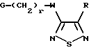 (57) Реферат: Описываются новые производные 1,2,5-тиадиазола или его кватернизованная форма, выбранные из соединений, имеющих общую формулу I, в которой W представляет кислород или серу; R выбран из группы, состоящей из водорода, галогена, R4, -OR4, -SR4, -SO2R4 и -Z-C4-12-(циклоалкилалкила); R4 выбран из группы, состоящей из C1-15-алкила, С2-15-алкенила и С2-15-алкинила, каждый из которых необязательно замещен одним или более заместителями, независимо выбранными из группы, состоящей из галогена, -CF3, фенила и фенокси, в которой фенил и фенокси необязательно замещен одним или более заместителями, независимо выбранными из группы, состоящей из галогена, – CN, С1-4-алкила, C1-4-алкокси, -OF3, -СF3; или R выбран из группы, состоящей из -OR5Y, -SR5Y, OR5-Z-Y, -SR5ZY, -O-R5Z-R4 и Z представляет кислород или серу; R5 представляет С1-15-алкил; Y представляет 5- или 6-членную гетероциклическую группу, выбранную из тиенила, пиридила и тиазолидонила; G выбран из азациклических или азабициклических кольцевых систем или G представляет необязательно замещенный C3-C8-циклоалкил, в котором циклоалкильные заместители выбраны из R1 и R2, или необязательно замещенный С1-6)-алкил, в котором заместителем является NR6R7; R6 и R7 оба представляют водород или C1-6-алкил; один из R1 и R2 представляет водород, а другой представляет водород или С1-6-алкил; R3 представляет водород или С1-5-алкил; m представляет 0, 1 или 2; р представляет 0, 1 или 2; q представляет 1 или 2; r представляет 0, 1 или 2; представляет одинарную или двойную связь, при условии, что, когда W представляет кислород и G представляет алкил, R выбран из группы, состоящей из водорода, R4, -OR4, -SR4, -SO2R4, -Z-C4-12-(циклоалкилалкила), каждый из которых необязательно замещен одним или более заместителями, независимо выбранными из группы, состоящей из галогена и -CF3; или R выбран из группы , состоящей из OR5Y, -SR5Y, OR5-Z-Y, -SR5ZY, -O-R5-Z-R4; Z представляет кислород или серу, R5 представляет С1-5-алкил; или его фармацевтически приемлемая соль или сольват. Изобретение относится к терапевтическим активным азациклическим или азабициклическим соединениям, способу их получения и к фармацевтическим композициям, включающим указанные соединения. Новые соединения полезны при лечении заболеваний центральной нервной системы, вызванных дисфункцией мускариновой холинэргической системы. 4 с. и 20 з.п.ф-лы, 5 табл.
