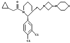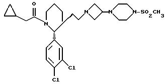 ПРИМЕР 133(S)-1-Циклопропилацетил-3-(3,4-дихлорфенил)-3-(2-[3- { 4-метансульфонил-пиперазин-1-ил}азетидин-1-ил]этил)пиперидин ![]() ![]() К раствору соединения ПОЛУЧЕНИЯ 42 (0,31 г, 0,88 ммоль), бистрифторацетата 3- (4-метансульфонилпиперазин-1-ил) азетидина (0,39 г, 1 мол. экв.) (ПОЛУЧЕНИЕ 46) и триэтиламина (0,122 мл, 1 мол. экв.) в тетрагидрофуране (10 мл) добавляли триацетоксиборогидрид натрия (186 мг, 1 мол. экв.) и ледяную уксусную кислоту (0,053 мл, 1,05 мол. экв.). Смесь перемешивали при комнатной температуре в течение 16 часов. Реакционную смесь затем концентрировали приблизительно до 3 мл и распределяли между этилацетатом (30 мл) и насыщенным водным раствором бикарбоната натрия (30 мл). Органический слой сушили над безводным сульфатом магния и фильтровали. Растворитель удаляли при пониженном давлении, получая остаток, который очищали флэш-хроматографией с использованием силикагеля и элюирования смесью дихлорметан:метанол (10:1 по объему), получая указанное в заголовке соединение (375 мг). Rf ТСХ = 0,35 (диоксид кремния, дихлорметан: метанол, 10: 1 по объему), LRMS m/z = 557 (М+1)+. Найдено: C 54,98; H 6,80; N 9,40. C28H38Cl2N4O3S 0,25CH2Cl2 Рассчитано: C 54,63; H 6,72; N 9,70%.