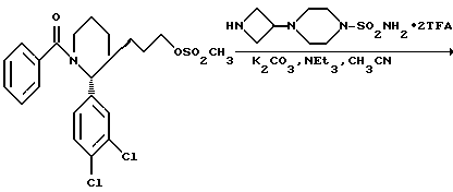 ПОЛУЧЕНИЕ 453-(3,4-Дихлорфенил)-3-(2-метансульфонилоксиэтил)-1- фенилсульфонилпиперидин ![]() К раствору соединения ПОЛУЧЕНИЯ 28 (109 мг, 0,29 ммоль) в дихлорметане (4 мл) в атмосфере азота при 0oC добавляли метансульфонилхлорид (0,026 мл, 1,2 мол. экв.). Реакционную смесь перемешивали при комнатной температуре в течение одного часа. Добавляли воду (30 мл) и насыщенный водный раствор бикарбоната натрия (30 мл) и смесь экстрагировали дихлорметаном (3 х 40 мл). Объединенные органические слои затем сушили при помощи безводного сульфата магния, фильтровали и растворитель удаляли при пониженном давлении. Это давало указанное в заголовке соединение (106 мг) в виде смолы, которую использовали без дальнейшей очистки. Rf ТСХ = 0,89 (диоксид кремния, метанол: дихлорметан, 1:19 по объему). ПОЛУЧЕНИЕ 46 Бистрифторацетат-3-(4-метилсульфонилпиперазин-1-ил)азетидина ![]() К раствору соединения ПОЛУЧЕНИЯ 44 (1,4 г, 5,8 ммоль) в дихлорметане (10 мл) при 0oC в атмосфере азота по каплям добавляли трифторуксусную кислоту (5 мл). Смеси затем давали нагреться до комнатной температуры и перемешивали в течение одного часа. Смесь концентрировали при пониженном давлении, получаемую смолу промывали диэтиловым эфиром, затем растирали с диэтиловым эфиром и фильтровали, получая указанное в заголовке соединение. LRMS m/z 220 (m + 1)+. 1H-NMR (d6-DMSO): = 2.4-2.5 (m, 2H), 2.9 (s, 3H), 3.1-3.2 (m, 4H), 3.3-3.5 (m, 1H), 3.8-4.0 (m, 4H), 8.7-8.9 (m, 3H).
