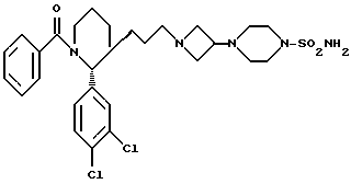 ПРИМЕР 143(R)-3-(3-[3-(4-Аминосульфонилпиперазин-1-ил)азетидин-1-ил] – пропил)-1-бензоил-3-(3,4-дихлорфенил)пиперидин ![]() ![]() Смесь соединения ПОЛУЧЕНИЯ 54 (190 мг, 0,404 ммоль), бистрифторацетата 1-аминосульфонил-4-(азетидин-3-ил)пиперазина (ПОЛУЧЕНИЕ 16) (542 мг, 3 мол. экв. ), карбоната калия (334 мг, 6 мол. экв.) и триэтиламина (0,335 мл, 6 мол. экв. ) в ацетонитриле (15 мл) нагревали при кипячении с обратным холодильником в течение 8 часов. Реакционную смесь охлаждали до комнатной температуры, добавляли дихлорметан (50 мл) и смесь промывали водой (100 мл). Органический слой сушили над безводным сульфатом магния и фильтровали. Растворитель удаляли при пониженном давлении, получая остаток, который хроматографировали на силикагеле при градиентном элюировании смесью этилацеат:метанол (градиент от 9:1 до 3:2 по объему), получая указанное в заголовке соединение (19 мг). LRMS (m/z) 515 (m-SO2NH2)+. 1H-NMR (CDCl3) : 1.6-1.9(m, 5H), 2.1-2.2 (m,1H), 2.25-2.45 (m,8H), 2.7-2.8 (m, 2H). 2.9-3.0 (m, 1H), 3.2-3.3 (m,7H), 3.35-3.5 (m,6H), 4.3-4.4 (m,1H), 7.25-7.5 (m,5H).