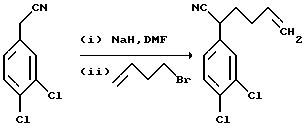 ПОЛУЧЕНИЕ 12-(3,4-Дихлорфенил)гекс-5-еннитрил ![]() К раствору гидрида натрия (14,8 г, 370,4 ммоль, 60% дисперсия в минеральном масле) в диметилформамиде (150 мл) при 0oC в атмосфере азота добавляли раствор 3,4-дихлорфенилацетонитрила (68,9 г, 1 мол. экв.) в диметилформамиде (300 мл) и смесь перемешивали в течение трех часов. Затем добавляли раствор 4 бромбут-1-ена (50 г, 1 мол. экв.) в диметилформамиде (100 мл) и смесь перемешивали при комнатной температуре в течение одного часа, затем нагревали до 60oC в течение пяти часов. Реакционную смесь затем охлаждали и добавляли воду (1 л). Смесь затем экстрагировали этилацетатом (2 х 500 мл). Объединенные органические слои промывали водой (2 х 1 л), сушили над безводным сульфатом магния и растворитель удаляли при пониженном давлении. Остаток затем очищали колоночной хроматографией с использованием силикагеля и градиентного элюирования смесью этилацетат: гексан (градиент от 1:19 до 1:6 по объему), получая указанное в заголовке (соединение (51,5 г). Rf ТСХ = 0,47 (диоксид кремния, гексан: этилацетат, 6:1 по объему). 1H-NMR (CDCl3): = 1.85-2.1 (m, 2H), 2.2-2.3 (m, 2H), 3.75-3.8 (m, 1H), 5.05-5.1 (m, 2H), 5.7-5.3 (m, 1H), 7.15-7.2 (m, 1H), 7.4-7.45 (m, 2H).