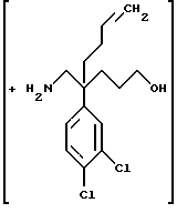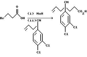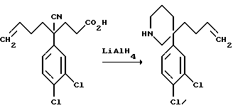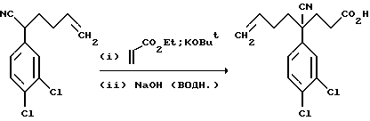 ПОЛУЧЕНИЕ 24-Циано-4-(3,4-дихлорфенил)окт-7-еновая кислота ![]() К раствору соединения ПОЛУЧЕНИЯ 1 (50,5 г, 210,4 ммоль) в диоксане (150 мл) при 0oC в атмосфере азота добавляли трет-бутоксид калия (1,5 г, 0,06 мол. экв. ) и этилакрилат (25,4 мл, 1,11 мол. экв.) и смесь перемешивали в течение одного часа. Затем добавляли водный раствор гидроксида натрия (2 н, 150 мл) и смесь перемешивали при комнатной температуре в течение семидесяти минут. Затем добавляли метил трет-бутиловый эфир (300 мл) и смесь подкисляли до pH 1 при помощи водного 2 н. раствора хлористоводородной кислоты. Раствор затем экстрагировали метил трет-бутиловым эфиром (2 х 300 мл) и объединенные органические слои затем сушили над безводным сульфатом магния и фильтровали. Удаление растворителя при пониженном давлении давало указанное в заголовке соединение (68,12 г), которое использовали в следующей стадии без дальнейшей очистки. 1H-NMR (CDCl3): = 1.8-2.6 (m, 9H), 4.9-5.0 (m, 2H), 5.65- 5.75 (m, 1H), 7.2-7.25 (m, 1H), 7.45-7.5 (m, 2H).