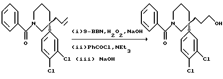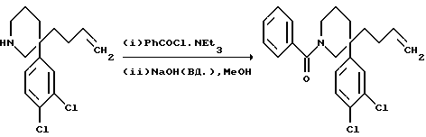 ПОЛУЧЕНИЕ 33-(Бут-1-ен-4-ил)-3-(3.4-дихлорфенил)пиперидин ![]() ![]() К раствору литийалюминийгидрида (16,6 г, 2 мол. экв.) в тетрагидрофуране (300 мл) при 0oC в атмосфере азота медленно добавляли раствор соединения ПОЛУЧЕНИЯ 2 (68,12 г) в тетрагидрофуране (300 мл) и реакционную смесь перемешивали в течение двух часов. Затем осторожно добавляли воду (60 мл), затем водный раствор гидроксида натрия (2 н, 300 мл). Смесь затем фильтровали и твердый остаток промывали метил трет бутиловым эфиром (300 мл). Органические промывные жидкости затем объединяли с фильтратом, сушили над безводным сульфатом магния, фильтровали и растворитель удаляли при пониженном давлении. Остаток затем хроматографировали с использованием силикагеля и градиентного элюирования смесью метанол: этилацетат (градиент от 1:19 до 2:5 по объему), получая указанное в заголовке соединение в виде смеси с нециклизованным аминоспиртом (19,6 г), которое использовали в следующей стадии без дальнейшей очистки. ПОЛУЧЕНИЕ 4 3-(Бут-1-ен-4-ил)-1-бензоил-3-(3,4-дихлорфенил)пиперидин. ![]() К раствору продукта ПОЛУЧЕНИЯ 3 (6,02 г) в дихлорметане (70 мл) при 0oC в атмосфере азота добавляли бензоилхлорид (9,37 мл, 4 мол. экв.) и триэтиламин (13,8 мл. 5 мол. экв.) и смесь перемешивали в течение 45 минут. Затем добавляют дихлорметан (50 мл) и смесь промывают 2 н. водным раствором хлористоводородной кислоты (2х100 мл). Органическую фазу затем сушат над безводным сульфатом магния и фильтруют. Растворитель удаляют при пониженном давлении. Затем добавляют 4% раствор гидроксида натрия в метаноле (100 мл) и смесь перемешивают при комнатной температуре в течение 50 минут. Затем добавляют дихлорметан (200 мл), смесь промывают водой (2 х 200 мл). Органическую фазу сушат над безводным сульфатом магния и затем фильтруют. Растворитель удаляют при пониженном давлении, получая остаток. Хроматография с использованием силикагеля и градиентного элюирования смесью этилацетат: гексан (элюент от 1:4 до 3:5, по объему) дала указанное в заголовке соединение (3,27 г). Rf ТСХ = 0,87 (диоксид кремния, гексан:этилацетат, 3:5 по объему). LRMS m/z 388 (m+1)+. 1H-NMR (CDCl3): = 1.3-2.2 (m, 8H), 3.1-3.5 (m, 3H), 1.5- 1.7 (m, 1H), 4.85-4.95 (m, 2H), 5.55-5.7 (m, 1H), 7.2-7.55 (m, 8H).