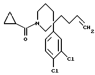 ПОЛУЧЕНИЕ 63- (Бут-1-ен-4-ил)-1-циклопропаноил-3-(3,4-дихлорфенил)пиперидин ![]() Это соединение получали таким же способом, как описан в ПОЛУЧЕНИИ 4, с использованием циклопропаноилхлорида вместо бензоилхлорида. LRMS m/z 352 (m+1)+. 1H-NMR (CDCl3): = 0.65-1.1 (m, 4H), 1.4-2.15 (m, 8H), 3.15-3.45 (m, 2H). 3.7-3.9 (m, 2H), 4.35-4.45 (m, 1H), 4.8-4.95 (m, 2H), 5.55-5.7 (m, 1H), 7.1-7.4 (m, 3H).
