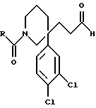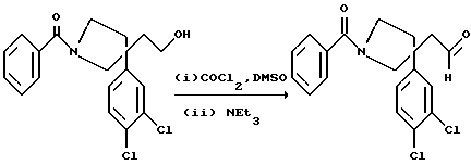 ПОЛУЧЕНИЕ 71-Бензоил-3-(3,4-дихлорфенил)-3-(2-формилэтил)пиперидин ![]() В раствор соединения ПОЛУЧЕНИЯ 4 (3,37 г, 8,7 ммоль) в метаноле (110 мл) в атмосфере азота при -78oC в течение десяти минут барботировали озон со скоростью 50 мл/мин (использовали силу тока 1,5 А для генерирования озона из кислорода). После этого силу тока снижали до нуля и через реакционную смесь в течение десяти минут барботировали кислород со скоростью 5 мл/мин. Подачу кислорода затем прекращали и через реакционную смесь в течение двенадцати минут барботировали азот. После этого времени по каплям добавляли раствор диметилсульфида (6,4 мл, 14 мол. экв.) в метаноле (15 мл) и реакционной смеси давали нагреться до комнатной температуры в течение восемнадцати часов. Растворитель затем удаляли при пониженном давлении и реакционную смесь распределяли между этилацетатом (20 мл) и водой (15 мл). Органический слой отделяли и водную часть далее экстрагировали этилацетатом (2 х 20 мл). Органические слои затем объединяли, сушили при помощи сульфата магния, фильтровали и растворитель выпаривали при пониженном давлении, получая указанное в заголовке соединение (3,18 г), которое использовали без дальнейшей очистки. 1H-NMR (CDCl3): = 1.3-2.1 (m, 6H), 3.15-3.25 (m. 4H), 3.35-3.55 (m, 2H), 7.2-7.45 (m, 8H), 9.6 (s. br., 1H).