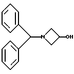ПОЛУЧЕНИЯ 8, 9Соединения общей формулы: ![]() получали способом, подобным способу, используемому в ПОЛУЧЕНИИ 7, с применением соединений ПОЛУЧЕНИЙ 5 и 6 соответственно (табл. 2) ПОЛУЧЕНИЕ 10 1-Дифенилметилазетидин-3-ол ![]() Раствор бензгидриламина (200 мл, 1,16 моль) и эпихлоргидрина (186 мл, 1 мол. экв. ) в метаноле (600 мл) перемешивали при комнатной температуре в течение пяти дней и затем нагревали при 40oC в течение двух дней. Растворитель затем удаляли при пониженном давлении, остаток растворяли в изопропиловом спирте (500 мл) и раствор нагревали при кипячении с обратным холодильником в течение шести часов. Раствор охлаждали до комнатной температуры и осадок отделяли фильтрованием. Эту твердую часть распределяли между дихлорметаном (400 мл) и насыщенным водным раствором бикарбоната натрия (500 мл). Водную фазу экстрагировали дихлорметаном (2 х 400 мл) и объединенные органические фазы сушили над сульфатом магния. Раствор затем фильтровали и растворитель удаляли из фильтрата при пониженном давлении, получая указанное в заголовке соединение (86 г) в виде кристаллического вещества. 1H-NMR (CDCl3): = 1.8-2.3 (s,br,1H), 2.85-2.9 (m, 2H), 3.5- 3.55 (m, 2H), 4.35 (s, 1H), 4.4-4.5 (m, 1H), 7.15-7.4 (m, 10H).