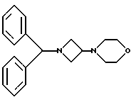 ПОЛУЧЕНИЕ 121-Дифенилметил-3-морфолиноазетидин ![]() Раствор 1-дифенилметил-3-метансульфонилоксиазетидина (см. ПОЛУЧЕНИЕ 11) (24,46 г, 7,72 ммоль), карбоната калия (32 г, 3 мол. экв.) и морфолина (7,34 мл, 1,09 мол. экв.) в ацетонитриле (200 мл) нагревали при кипячении с обратным холодильником в течение четырех часов. Раствор затем охлаждали до комнатной температуры, добавляли воду (50 мл) и смесь концентрировали при пониженном давлении. Остаток распределяли между этилацетатом (400 мл) и водой (400 мл) и органическую фазу отделяли и промывали водой (2 х 400 мл). Органическую фазу сушили над сульфатом магния, фильтровали и растворитель удаляли из фильтрата при пониженном давлении. Остаток затем хроматографировали с использованием силикагеля и элюирования смесью гексан:диэтиловый эфир (1:1 по объему), получая указанное в заголовке соединение (16,5 г). 1H-NMR (CDCl3): = 2.25-2.3 (m,4H), 2.85-3.05 (m,3H), 3.35-3.4 (m,2H), 3.7-3.75 (m,4H), 4.45 (s,1H), 7.15-7.45 (m,10H).