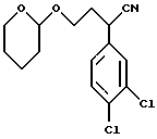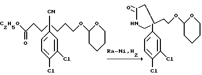 ПОЛУЧЕНИЕ 172-(3,4-Дихлорфенил)-4-(тетрагидропиран-2-илокси)бутаннитрил ![]() К смеси 60% (масс. /масс.) дисперсии гидрида натрия в масле (19,24 г, 1,05 мол. экв.) в сухом тетрагидрофуране (450 мл) при 0oC в атмосфере азота по каплям, в течение сорока минут, добавляли раствор 3,4-дихлорфенилацетонитрила (89,5 г, 1 мол. экв.) в сухом тетрагидрофуране (450 мл). Через дополнительные сорок минут добавляли раствор 2-бромэтокситетрагидропирана (100 г, 1 мол. экв.) в тетрагидрофуране (100 мл) и смеси давали нагреться до комнатной температуры и перемешивали в течение четырнадцати часов. Добавляли 30% водный раствор хлорида натрия (500 мл) и смесь экстрагировали диэтиловым эфиром (2 х 400 мл). Органические слои объединяли и промывали водой (2 х 400 мл), сушили над сульфатом магния и растворитель удаляли при пониженном давлении. Остаток затем хроматографировали с использованием силикагеля и градиентного элюирования смесью диэтиловый эфир:гексан (градиент от 1:9 до 1:1, по объему), получая указанное в заголовке соединение (51 г). Rf ТСХ = 0,55 (диоксид кремния, метил-трет- бутиловый эфир:гексан, 1:1, по объему). LRMS m/z= 333 (m+NH4)–. 1H-NMR (CDCl3): =1.5-1.9 (m, 6H), 2.05-2.3 (m, 2H), 2.4-2.65 (m, 2H), 2.8-2.95 (m, 2H), 4.0-4.1 (m, 1H), 4.5-4.6 (m, 1H), 7.2-7.25 (m, 1H), 7.25-7.5 (m, 2H).