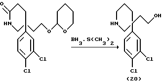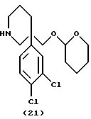 ПОЛУЧЕНИЕ 20 и 213-(3,4-Дихлорфенил)-3-(2-гидроксиэтил)пиперидин (Получение 20) и 3-(3,4-дихлорфенил)-3-(2-[тетрагидропиран-2-илокси] этил)пиперидин (Получение 21) ![]() ![]() К раствору 5-(3,4-дихлорфонил)-5-(2-[тетрагидропиран-2- илокси]этил)-2(1H)-пиперидона (ПОЛУЧЕНИЕ 19) (1,75 г, 4,7 ммоль) в тетрагидрофуране при 0oC в атмосфере азота добавляли по каплям раствор комплекса боран-диметилсульфид (2,36 мл, 5 мол. экв., 10 М раствор). Раствор затем медленно нагревали до комнатной температуры и затем нагревали при кипячении с обратным холодильником в течение двух часов. Раствор охлаждали до комнатной температуры и растворитель затем удаляли при пониженном давлении. Остаток затем распределяли между дихлорметаном (30 мл) и насыщенным водным раствором бикарбоната натрия (30 мл). Водную фазу экстрагировали дополнительной порцией дихлорметана (30 мл) и объединенные органические слои сушили при помощи безводного сульфата магния. Раствор затем фильтровали и растворитель удаляли при пониженном давлении. Остаток очищали колоночной хроматографией с использованием диоксида кремния и элюирования смесью метанол: дихлорметан (1:19 по объему), получая сначала спирт (20) в виде комплекса боран-диметилсульфид и вторым защищенный спирт (21) (132 мг). Фракции, содержащие комплекс борана (20) выпаривали при пониженном давлении, остаток растворяли в метаноле (10 мл) и 2 н. водной хлористоводородной кислоте (10 мл) и смесь нагревали при кипячении с обратным холодильником в течение одного часа. Раствор затем охлаждали до комнатной температуры и растворитель удаляли при пониженном давлении, получая спирт (20) (424 мг). Спектральные данные для (20): LRMS m/z 274 (m+1)+; 1H-NMR (CDCl3): = 1.45-2.0 (m, 6H), 2.3 (s, br.,2H), 2.7-2.8 (m. 1H), 2.85-2.95 (m, 1H), 3.1 (s, br., 2H), 3.35-3.55 (m, 2H), 7.1-7.2 (m, 1H), 7.35-7.4 (m, 2H).