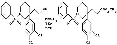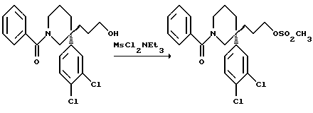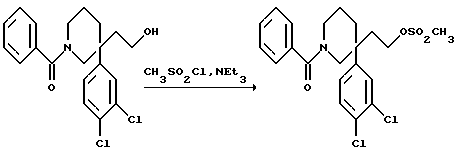 ПОЛУЧЕНИЕ 543(R)-1-Бензоил-3-(3,4дихлорфенил)-3-(3-метансульфонилоксипропил) пиперидин ![]() К раствору соединения ПОЛУЧЕНИЯ 53 (320 мг, 0,82 моль) в дихлорметане (10 мл) в атмосфере азота, охлажденному на бане со льдом и водой, добавляли триэтиламин (0,34 мл, 3 мол. экв.) и метансульфонилхлорид (0,096 мл, 1,5 мол. экв.). Смесь перемешивали в течение пятнадцати минут. Затем добавляли дихлорметан (50 мл) и раствор промывали водой (100 мл). Органическую фазу сушили над безводным сульфатом магния, фильтровали и растворитель удаляли при пониженном давлении, получая указанное в заголовке соединение (390 мг), которое использовали без дальнейшей очистки. Rf ТСХ = 0,28 (диоксид кремния, гексан:этилацетат, 2:3 по объему). 1H ЯМР (CDCl3): 1,25-4,4 (м, 17H), 7,25-7,55 (м, 8H).