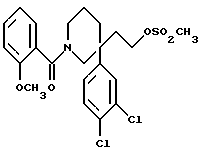 ПОЛУЧЕНИЕ 251-(2-Метоксибензоил)-3-(3,4-дихлорфенил)-3-(2- метансульфонилоксиэтил)пиперидин ![]() Это соединение получали способом, сходным со способом, использованным в ПОЛУЧЕНИИ 24, применяя соединение, описанное в ПОЛУЧЕНИИ 23. LRMS 486 m/z (m+1)+. 1H-NMR (CDCl3): = 1.4-2.4 (m, 6H), 2.9-4.6 (m, 12H), 6.75-7.6 (7H).