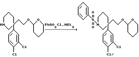 ПОЛУЧЕНИЕ 271-(Фенилсульфонил)-3-(3,4-дихлорфенил)-3-([тетрагидрапиран-2- илoкcи] этил)пиперидин ![]() К раствору соединения ПОЛУЧЕНИЯ 21 (123 мг, 0,34 ммоль) в дихлорметане (3 мл) при 0oC в атмосфере азота добавляли три этиламин (0,06 мл, 1,5 мол. экв. ) и бензолсульфонилхлорид (0,07 мл, 1,2 мол. экв.). Реакционную смесь перемешивали в течение одного часа. Затем добавляли воду (10 мл) и насыщенный водный бикарбонат натрия (10 мл) и смесь экстрагировали дихлорметаном (3 х 10 мл). Объединенные органические слои затем сушили над безводным сульфатом магния, фильтровали и растворитель удаляли при пониженном давлении, получая смолу, которую хроматографировали с использованием силикагеля и элюирования дихлорметаном, получая указанное в заголовке соединение (131 мг). Rf ТСХ = 0,92 (диоксид кремния, дихлорметан:метанол, 19:1 по объему). LRMS m/z 515 (m+NH4)+. 1H-NMR (CDCl3): = 1.45-2.05 (m, 12H), 2.55-2.65 (m, 2H), 2.95-3.1 (m, 1H), 3.3-3.55 (m, 3H), 3.7-3.8 (m, 1H), 3.9-4.05 (m, 1H), 4.3-4.4 (m, 1H), 7.3-7.8 (m, 8H).