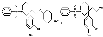 ПОЛУЧЕНИЕ 281-(Фенилсульфонил)-3-(3,4-дихлорфенил)-3-(2-гидроксиэтил)пиперидин ![]() К насыщенному раствору хлористого водорода в метаноле (5 мл) при комнатной температуре добавляли соединение ПОЛУЧЕНИЯ 27 (125 мг) и смесь перемешивали при комнатной температуре в течение двух часов. Растворитель затем удаляли при пониженном давлении. Затем добавляли насыщенный водный раствор бикарбоната натрия (30 мл) и водную фазу экстрагировали этилацетатом (3 х 30 мл). Объединенные органические фазы затем сушили над безводным сульфатом магния, фильтровали и растворитель удаляли при пониженном давлении, получая указанное в заголовке соединение (155 мг), которое использовали без дальнейшей очистки. Rf ТСХ (диоксид кремния, дихлорметан:метанол, 19:1 по объему). LRMS m/z 414 (m+1)+. 1H-NMR (CDCl3): = 1.45-2.5 (m, 12H), 2.55-2.65 (m, 2H), 2.95-3.1 (m, 1H), 3.3- 3.55 (m, 3H), 3.7-3.8 (m, 1H), 3.9-4.05 (m, 1H), 4.3-4.4 (m, 1H), 7.3-7.8 (m, 8H).