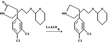 ПОЛУЧЕНИЕ 313-(3,4-Дихлорфенил)-3-(2-[тетрагидропропиран-2-илокси]этил) пирролидин ![]() К раствору литийалюминийгидрида (100 мг, 2 мол. экв.) в сухом диэтиловом эфире (20 мл) при 0oC в атмосфере азота добавляли раствор соединения ПОЛУЧЕНИЯ 30 (0,5 г, 1,4 ммоль) в диэтиловом эфире (20 мл) и смесь перемешивали в течение 24 часов. Затем добавляли следующую порцию литийалюминийгидрида (50 мг, 1 мол. экв.) и реакционную смесь перемешивали в течение дополнительных 2 часов. Добавляли воду (0,1 мл), затем 15% водный раствор гидроксида натрия (0,1 мл) и воду (0,3 мл). Твердую часть удаляли фильтрованием. Фильтрат затем концентрировали при пониженном давлении, получая масло. Хроматография с использованием силикагеля и элюирования смесью дихлорметан:метанол: аммиак (94: 5:1 по объему) дала указанное в заголовке соединение (200 мг). Rf ТСХ = 0,42 (диоксид кремния, дихлорметан:метанол:аммиак, 90:9:1 по объему). 1H-NMR (CDCl3): = 1.45-1.85 (m, 6H), 1.9-2.25 (m, 6H), 2.95-3.2 (m, 4H), 3.2-3.65 (m, 2H), 3.7-3.8 (m, 1H), 4.35-4.45 (m, 1H), 7.1-7.4 (m, 3H).