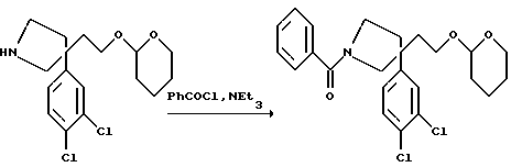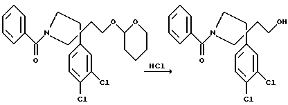 ПОЛУЧЕНИЕ 321-Бензоил-3-(3,4-дихлорфенил)-3-(2-[тeтpaгидpoпиpaн-2-илокси] этил)пирролидин ![]() К раствору соединения ПОЛУЧЕНИЯ 31 (1,4 г, 4,06 ммоль) в дихлорметане (20 мл) добавляли триэтиламин (0,57 мл, 1 мол. экв.). Раствор затем охлаждали до 0oC. По каплям добавляли бензоилхлорид (0,47 мл, 1 мол. экв.) и раствор перемешивали при 0oC в течение 30 минут и затем при комнатной температуре в течение 1 часа. Сырую реакционную смесь промывали водой (50 мл) и затем насыщенным водным раствором бикарбоната натрия (50 мл). Органический слой сушили с использованием безводного сульфата магния, фильтровали и растворитель удаляли при пониженном давлении, получая масло. Хроматография с использованием силикагеля и градиентного элюирования смесью метанол:дихлорметан (градиент от 1:19 до 1:9 по объему) давала указанное в заголовке соединение (1,5 г). LRMS m/z 448 (m+1)+. 1H-NMR (CDCl3): = 1.25-2.4 (m, 10H), 3.0-4.4 (m, 9H), 6.9-7.6 (m, 8H).