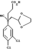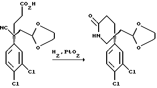 ПОЛУЧЕНИЕ 384(S)-4-Циано-4-(3,4-дихлорфенил)-5-(1,3-диоксолан-2-ил)пентан- 1-овая кислота ![]() К 1,0 М раствору гексаметилдисилилазида лития в тетрагидрофуране (4,69 л) в атмосфере азота по каплям, в течение 45 минут, при 5oC добавляли раствор 3,4-дихлорфенилацетонитрила (750 г, 4,28 моль) в тетрагидрофуране (750 мл). Реакционную смесь перемешивали в течение 2 часов. Реакционную смесь снова охлаждали снова до 5oC и по каплям, в течение пятидесяти минут, добавляли раствор 2-бромметил-1,3- диоксолана (782 г) в тетрагидрофуране (780 мл). По частям добавляли иодид тетра-н-бутиламмония (75 г) и смеси давали нагреться до комнатной температуры и перемешивали в течение 14 часов. Реакционную смесь затем охлаждали до 5oC и по каплям добавляли раствор гексаметилдисилилазида лития в тетрагидрофуране (1,0 М, 4,69 л). Смесь перемешивали в течение 5 часов при комнатной температуре. Раствор охлаждали до 5oC и по каплям, в течение 50 минут, добавляли раствор этил 3-бромпропаноата (840,5 г) в тетрагидрофуране (840 мл). Реакционную смесь перемешивали в течение 14 часов. Реакционную смесь охлаждали до 5oC и добавляли 1,5 М водный раствор гидроксида натрия (4,25 л, содержащий 255 г гидроксида натрия) и смесь экстрагировали этилацетатом (2 х 3 л). Объединенные органические слои промывали водой (2 х 5 л). Водные фазы объединяли и подкисляли до pH 1 при помощи 5 н. водного раствора хлористоводородной кислоты и затем экстрагировали этилацетатом (2 х 3 л). Объединенные органические экстракты концентрировали при пониженном давлении до концентрации приблизительно 3 мл/г на основе теоретического выхода продукта. Добавляли дихлорметан (50 мл) и раствор промывали водой (100 мл). Органическую фазу сушили над безводным сульфатом магния, фильтровали и растворитель удаляли при пониженном давлении, получая указанное в заголовке соединение (390 г), которое использовали без дальнейшей очистки. Rf ТСХ = 0,28 (диоксид кремния, смесь гексан:этилацетат, 2:3 по объему). 1H-NMR (CDCl3): = 1.25-4.4 (m,17H), 7.25-7.55 (m, 8H).