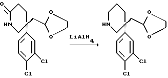 ПОЛУЧЕНИЕ 403(S)-3-(3,4-Дихлорфенил)-3-(1,3-диоксолан-2-илметил)пиперидин ![]() К перемешиваемому раствору литийалюминийгидрида (12,7 мл 1 М раствор в тетрагидрофуране, (2,1 мол. экв. ) в тетрагидрофуране (60 мл) в атмосфере азота добавляли 5(S)-5-(3,4-дихлорфенил)-5- (1,3-диоксолан-2-илметил)-2(1H)-пиперидон (2 г, 6,06 ммоль) (ПОЛУЧЕНИЕ 39) в виде трех порций и смесь нагревали при кипячении с обратным холодильником в течение шестнадцати часов. По каплям, в течение двадцати минут, добавляли воду (0,48 мл) и затем водный раствор гидроксида натрия (0,48 мл, 15% раствор, масс. /масс.). Через пять минут добавляли воду (2 х 0,48 мл) и смесь перемешивали в течение тридцати минут. Смесь фильтровали и растворитель удаляли из фильтрата при пониженном давлении и остаток распределяли между этилацетатом (100 мл) и насыщенным водным раствором бикарбоната натрия (100 мл). Органический слой сушили над безводным сульфатом магния, получая масло, которое затем подвергали колоночной флэш-хроматографии с использованием силикагеля и элюирования смесью дихлорметан: метанол (9:1), получая указанное в заголовке соединение (1,3 г). 1H-NMR (CDCl3): = 1.4-1.5 (m, 1H), 1.55-1.7 (m, 1H), 1.8- 1.9 (m, 1H), 1.95-2.0 (m, 2H), 2.05-2.1 (m, 1H), 2.3 (s, br., 1H), 2.8-2.9 (m, 2H), 3.0-3.1 (m, IH), 3.3-3.35 (m, IH), 3.6-3.7 (m, 2H), 3.8-3.9 (m, 2H), 4.3-4.4 (m, IH), 7.2-7.3 (m, 1H), 7.4-7.5 (m, 2H).