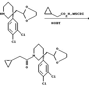 ПОЛУЧЕНИЕ 413(S)-1-Циклопропилацетил-3-(3,4-дихлорфенил)-3-(1,3-диоксолан- 2-ил)метил)пиперидин ![]() К раствору соединения ПОЛУЧЕНИЯ 40 (0,65 г, 2,06 ммоль) в дихлорметане (20 мл) при комнатной температуре в атмосфере азота добавляли циклопропилуксусную кислоту (206 мг, 1 мол. экв.), М- метилморфолин (0,23 мл, 1 мол. экв. ), гидрат 1- гидроксибензотриазола (0,316 г, 1 мол. экв.) и гидрохлорид 1-(3- диметиламинопропил)-3-этилкарбодиимида (0,546 г, 1,4 мол. экв.). Смесь перемешивали в течение шестнадцати часов. Смесь затем выливали в этилацетат (50 мл) и насыщенный водный раствор бикарбоната натрия и органическую фазу отделяли и сушили над безводным сульфатом магния. Раствор фильтровали, растворитель удаляли при пониженном давлении и остаток хроматографировали с использованием силикагеля и элюирования смесью этилацетат:гексан (1:1 по объему), получая указанное в заголовке соединение (0,7 г). RfTCX = 0,25 (диоксид кремния, смесь этилацет:гексан, 1:1 по объему). LRMS m/z = 398 (m+1)+. 1H-NMR (CDCl3): = 0.05-0.2 (m, 2H), 0.4-0.5 (m, 2H), 0.85-0.95 (m, 1H), 1.35-2.4 (m, 8H), 3.1-4.2 (m, 9H), 4.7-4.75 (m, 1H), 7.2-7.5 (m, 3H).