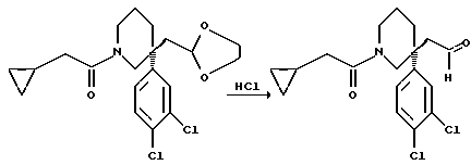 ПОЛУЧЕНИЕ 423(S)-1-Циклопропилацетил-3-(3,4-дихлорфенил)формилметилпиперидин ![]() К раствору соединения ПОЛУЧЕНИЯ 41 (0,7 г, 1,76 ммоль) в тетрагидрофуране (10 мл) добавляли хлористоводородную кислоту (10 мл, 5 н. раствор) и смесь перемешивали при комнатной температуре в течение 5 часов. Смесь затем распределяли между этилацетатом (30 мл) и насыщенным водным раствором бикарбоната натрия (30 мл) и органическую фазу сушили над безводным сульфатом магния. Растворитель удаляли при пониженном давлении, получая указанное в заголовке соединение (0,62 г), которое использовали без дальнейшей очистки. 1H-NMR (CDCl3): = 0.1-0.2 (m, 2H), 0.5-0.6 (m, 2H), 0.9-1.0 (m, 1H), 1.6-2.3 (m, 6H), 2.65-2.7 (m, 2H), 3.4-3.5 (m, 2H), 3.8, (d, 1H), 4.05 (d, 1H), 7.3-7.5 (m, 3H), 9.5 (s, 1H).