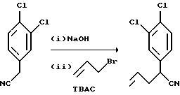 ПОЛУЧЕНИЕ 472-(3,4-Дихлорфенил)пент-4-еннитрил ![]() К перемешиваемому раствору 3,4-дихлорфенилацетонитрила (800 г, 4,3 моль) в циклогексане (16 л) при комнатной температуре осторожно добавляли водный раствор гидроксида натрия (1600 г гидроксида натрия в 8 л воды). Это добавление вызывало повышение температуры реакции до 50oC. Затем добавляли аллилбромид (572 г, 1,1 мол. экв.) и гидрат хлорида тетра-и-бутиламмония (40 г, 0,03 мол. экв.) и реакционную смесь перемешивали в течение одного часа при 50oC. Водную фазу удаляли и органический слой промывали водой (10 л). Органическую фазу фильтровали через силикагель (1 кг) при пониженном давлении, получая желтый раствор. Из фильтрата при пониженном давлении удаляли растворитель, получая указанное в заголовке соединение в виде масла (960 г) с чистотой 70%, которое использовали без дальнейшей очистки. Rf ТСХ = 0,71 (диоксид кремния, диэтиловый эфир: гексан, 1:1 по объему). LRMS m/z = 226 (m+1)+. 1H-NMR (CDCl3): = 2.6-2.75 (m, 2H), 3.85 (t, 1H), 5.1-5.25 (m, 2H), 5.7-5.9 (m, 1H), 7.2-7.25 (m, 1H), 7.5-7.55 (m, 2H).