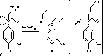 ПОЛУЧЕНИЕ 49Соль (R)-(+)-1-(1-нафтил)этиламина и 4(S)-4-циано-4-(3,4- дихлорфенил)гепт-6-еновой кислоты К раствору соединения ПОЛУЧЕНИЯ 48 (16 г) в этилацетате (50 мл) добавляли (R)-(+)-1-(1нафтил)этиламин (4,8 г). Раствор перемешивали в течение тридцати минут при комнатной температуре и затем- растворитель удаляли при пониженном давлении, получая смолу. Смолу частично растворяли в смеси гексан:диэтиловый эфир (4:1 по объему, 150 мл) и стенки колбы царапали для индуцирования кристаллизации. Образуемый белый продукт отделяли фильтрованием и перекристаллизовали три раза из этилацетата, получая указанное в заголовке соединение (4,9 г). Т. пл. 153-154oC. [ ]25589-7.1o (с = 0.0012).