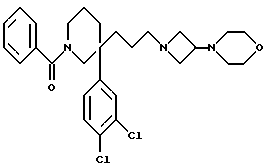 ПРИМЕРЫ 2-8Соединения следующей общей формулы, ![]() получение которых приведено в виде таблицы 1, получали способом, сходным со способом, который использован в ПРИМЕРЕ 1, с применением подходящего альдегида (см. ПОЛУЧЕНИЯ 7, 8, 9, 36 и 37) и либо дигидрохлорида 3-морфолиноазетидина (ПОЛУЧЕНИЕ 13) или бистрифторацетата 3-(4-аминосульфонилпиперазин-1-ил)азетидина (ПОЛУЧЕНИЕ 16). ПРИМЕР 9 1-Бензоил-3-(3,4-дихлорфенил)-3-(2-[3-морфолиноазетидин-1- ил] этил)пиперидин ![]() ![]() К раствору мезилата (см. ПОЛУЧЕНИЕ 24) (137 мг, 0,3 ммоль) добавляли дигидрохлорид 3-морфолиноазетидина (ПОЛУЧЕНИЕ 13) (160 мг, 3 мол. экв.), триэтиламин (0,125 мл, 3 мол. экв.) и карбонат калия (83 мг, 2 моль. экв.) в ацетонитриле (5 мл) и смесь нагревали при кипячении с обратным холодильником в течение четырех часов. Реакционную смесь охлаждали до комнатной температуры, добавляли воду (2 мл) и ацетонитрил удаляли при пониженном давлении. Затем добавляли насыщенный водный бикарбонат натрия (20 мл) и этилацетат (20 мл) и волную фазу экстрагировали этилацетатом (3 х 20 мл). Объединенные органические слои затем сушили с использованием безводного сульфата магния, фильтровали и растворитель удаляли при пониженном давлении. Остаток хроматографировали с использованием силикагеля и градиентного элюирования смесью дихлорметан:метанол (градиент от 9:1 до 4: 1, по объему), получая указанное в заголовке соединение (43 мг). Rf = 0,16 (диоксид кремния, дихлорметан:метанол, 19:1 по объему). LRMS m/z 502 (М+1)+. 1H-NMR (CDCl3): 1.35-1.95 (m, 6H), 2.05-2.15 (m, 2H), 2.25-2.4 (m, 4H), 2.7-2.95 (m, 3H), 3.3-3.6 (m, 5H), 3.65-3.75 (m, 4H), 4.35-4,5 (M, 1H), 7.2-7.5 (m,8H).