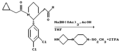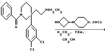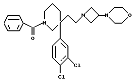 Таким образом, изобретение далее представляет:i) фармацевтическую композицию, содержащую соединение формулы (I) или его фармацетически приемлемую соль вместе с фармацевтически приемлемым разбавителем или носителем; ii) соединение формулы (I) или его фармачетически приемлемую соль или композицию для использования в качестве лекарственного средства; iii) использование соединения формулы (I) или его фармацевтически приемлемой соли или композиции для приготовления лекарственного средства для лечения болезни путем оказания антагонистического эффекта на тахикинин, действующего у рецептора NK1, NK2 или NK3 человека или комбинации двух или более их; (iv) использование как в (iii), где болезнь представляет воспалительную болезнь, такую как артрит, псориаз, астма или воспалительная болезнь кишечника, нарушение центральной нервной системы (ЦHС), такое как страх, депрессия, деменция или психоз, желудочно-кишечное (ЖК) нарушение, такое как функциональная болезнь кишечника, синдром раздраженной толстой кишки, гастроэзофагеальный рефлекс, недержание кала, колит или болезнь Крона, нарушение мочеполового тракта, такое как недержание мочи или цистит, легочное нарушение, такое как хроническая закупорка дыхательных путей, аллергия, такая как экзема, контактный дерматит или ринит, повышенная чувствительность, такая как чувствительность к ядовитому плющу, периферическая невропатия, такая как диабетическая невропатия, невралгия, каузалгия, болезненная невропатия, ожог, герпетическая невралгия или послегерпетическая невралгия, кашель или острая или хроническая боль; v) способ лечения болезни человека путем индуцирования антагонистического эффекта на тахикинин, действующего у рецептора NK1, NK2 или NK3 человека или комбинации двух или более их, который заключается в лечении этого человека эффективным количеством соединения формулы (I) или его фармацевтически приемлемой соли или композиции; vi) способ как в (v), где болезнь представляет воспалительную болезнь, такую как артрит, псориаз, астма или воспалительная болезнь кишечника, нарушение центральной нервной системы (ЦHС), такое как страх, депрессия, деменция или психоз, желудочно-кишечное (ЖК) нарушение, такое как функциональная болезнь кишечника, синдром раздраженной толстой кишки, гастроэзофагеальный рефлекс, недержание кала, колит или болезнь Крона, нарушение мочеполового тракта, такое как недержание мочи или цистит, легочное нарушение, такое как хроническая закупорка дыхательных путей, аллергия, такая как экзема, контактный дерматит или ринит, повышенная чувствительность, такая как чувствительность к ядовитому плющу, периферическая невропатия, такая как диабетическая невропатия, невралгия, каузалгия, болезненная невропатия, ожог, герпетическая невралгия или послегерпетическая невралгия, кашель или острая или хроническая боль. vii) соединение формулы (II), (IIIA), (XXII), (XXIII), (XXIV), (XXV), (XXVI), (XXVII), (XXVIII), (XXIX) или (XXX). Следующие примеры иллюстрируют получение соединений формулы (I). ПРИМЕР 1. 1-Бензоил-3-(3,4-дихлорфенил)-3-(3-[3-морфолиноазетидин-1-ил] пропил) пиперидин ![]() ![]() К раствору альдегида (см. ПОЛУЧЕНИЕ 7) (0,48 r, 1,23 ммоль) и дигидрохлорида 3-морфолиноазетидина (см. ПОЛУЧЕНИЕ 13) (0,291 г, 1,1 мол. экв.) в тетрагидрофуране (20 мл) к атмосфере азота добавляли триэтиламин (0,38 мл, 2,2 мол. экв.). Через тридцать минут добавляли триац