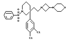 ПРИМЕР 113-(3,4-Дихлорфенил)-3-(2-[3-морфолиноазетидин-1-ил] этил)-1- фенилсульфонилпиперидин ![]() Это соединение получают способом, сходным со способом, используемым в ПРИМЕРЕ 9, с применением мезилата, полученного в ПОЛУЧЕНИИ 45. LRMS (m/z) 538 (М+1)+. Найдено: C 57,26; H 6,01; N 7,97. C26H33Cl2 N3O3S 0,1CH2Cl2Рассчитано: C 57,31; H 6,11; N 7,68%. 1H-NMR(CDCl3): = 1.5-1.9 (m, 6H), 1.95-2.1 (m,1H), 2.15-2.3 (m,5H), 2.7-3.0 (m, 5H), 3.1-3.2 (m,1H), 3.3-3.5 (m,2H), 3.55-3.75 (m, 5H), 7.2-7.3 (m, 1H), 7.35-7.45 (m, 2H), 7.5-7.65 (m, 3H), 7.7-7.8 (m, 2H).