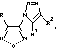 Наиболее близким к описываемым соединениям по действию и структуре является известный 1-бензил-3-[5-(гидроксиметил)-2-фуранил]индазол (YC-1) формулы II:![]() усиливающий активацию рГЦ различными модуляторами активности данного фермента, в том числе и донорами NO (A.Mulsch, J. Bauersachs et al. “Effect of YC-1, an NO-independent, superoxidesensitive stimulator of soluble guanylyl cyclase, on smooth muscle responsiveness to nitrovasodilators” Br. J. Pharmacol. 1997, v. 120, p. 681-689 [4]). Так, YC-1 в концентрации 3 мкМ обладал максимальным потенцирующим эффектом, он усиливал активацию рГЦ из легких быка 1 мкМ ННП в 2.3 раза, при этом он сам активировал фермент ~ в 2 раза. В результате изучения влияния YC-1 на активность рГЦ было сделано предположение о наличии на ферменте аллостерического участка связывания данного соединения. Показано, что в результате взаимодействия YC-1 с рГЦ уменьшается скорость диссоциации NO из комплекса нитрозил-гем и увеличивается максимальная скорость ферментативной реакции (A. Friebe, M. Russwunn et al. “A point-mutated guanylyl cyclase with features of theb YC-1 stimulated enzyme: implications for the YC-1 binding site?” Biochemistry 1999, v. 38, p. 15253-15257 [5]). В настоящее время проводится широкий поиск соединений, способных селективно потенцировать активацию рГЦ NO-генерирующими соединениями и усиливать их антигипертензивное действие, при этом особый интерес представляют такие вещества, которые не оказывают выраженного влияния на другие биологические объекты. Однако показано, что YC-1 активирует эндотелиальную NO-синтазу (P. Wohlfart, T. Malinski et al. “Release of nitric oxide from endothelial cells stimulated by YC-1, an activator of soluble guanylyl cyclase” Br. J. Pharmacol. 1999, v. 128, p. 1316-1322 [6]) и ингибирует различные изоформы фосфодиэстераз циклических нуклеотидов (J. Galle, U. Zabel et al. “Effects of the soluble guanylyl cyclase activator, YC-1, on vascular tone cyclic GMP levels and phosphodiesterase activity” Br. J. Pharmacol. 1999, v. 127, p. 195-203 [7]). Цель изобретения – создание новых азолсодержащих гетероциклических соединений, обладающих селективным потенцирующим действием на NO-зависимую активацию рГЦ. Цель достигается новыми производными (1,2,3-триазолил)-1,2,5-оксадиазола вышеуказанной общей формулы I, где R, R1 и R2 имеют вышеуказанные значения, потенцирующими NO-зависимую активацию рГЦ. Описываемые производные (1,2,3-триазолил)-1,2,5-оксадиазола вышеуказанной общей формулы I, получают кипячением соответствующих моноазидофуразана и замещенного ацетилена (или 1,3-дикарбонильного соединения) в метиловом или этиловом спирте с последующим выделением полученных продуктов обычными приемами. Предложенный способ основан на известных реакциях циклоприсоединения азидов к соответствующим производным ацетилена (Th. Finley, Chem. Heterocyclic Compounds/Eds. A. Weissberger, E. C. Taylor. New-York, 1980, v. 39, p. 1 [8]) или 1,3-дикарбонильным соединениям (A. Group, M. Kovacic, B. Kranjc-Skraba, B. Mihelchic, S. Simonic, B. Stanovnik and M. Tisler “Reactions of azidoazolopyridazines with 1,3-dicarbonylic compounds”, Tetrahedron, 1974, v. 30, p. 2251-2256 [9]), при необходимости, с последующей модификацией функциональных групп синтезированных соединений. В качестве исходных азидов использовали 3-азидо-4-аминофуразан, полученный диазотированием 3,4-диаминофуразана нитрозилсерной кислотой с последующей обработкой соли диазония азидом натрия (О.А. Ракитин, О.А. Залесова, А.С. Куликов, Н.Н. Махова, Т.И. Годовикова и Л.И. Хмельницкий “Синтез и реакционная способность фуразанил- и фуроксанилдиазониевых солей”, Изв. РАН, Сер. хим., 1993, N 11, с. 1949-1953 [10] ) и 5-[4-азидо(1,2,5)оксадиазолил] -5H-[1,2,3] триазоло[4,5-с] [1,2,5] оксадиазол, полученный взаимодействием бисдиазониевой соли диаминоазофуразана с азидо
