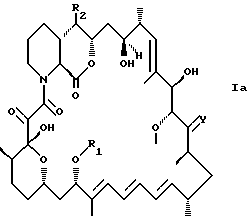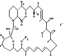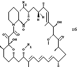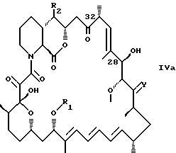 32(S)-дигидро-40-O-(2-метокси)этилрапамицин: 1H ЯМР (CDCl3) 2:1 смесь ротамеров, химические сдвиги в скобках относительно минорного ротамера 0,77 (1H, dd, H-38ax), 1,67 (6H, s, C17-CH3 и C29-CH3), 2,50 (1H, m, H- 31), 3,01 (1H, m, H-25), 3,12 (2H, m, H-39 и H-40), 3,14 (3,15) (3H, s, OCH3), 3,28 (1H, m, H-32), 3,36 (3,34) (3H, s, OCH3), 3,39 (3,38) (3H, s, OCH3), 3,48 (3,46) (3H, s, OCH3), 3,55 и 3,75 (4H, 2m, OCH2CH2O), 3,84 (1H, m, H-14), 4,12 (4,16) (1 H, d, H-28), 4,73 (1H, s, C10-OH), 5,03 (1H, m, H-34)MS (FAB) m/z 980 ([M + Li]+) Пример 5: (32S)-дигидро-40-O-(2-гидрокси)этилрапамицин (R1=CH3; R2=II, где R3 = -CH2CH2OH и R4 = CH3; X = OH; Y = O) Титульное соединение получают по способу, описанному в Примере 4, но с использованием подходящего исходного материала. (32S)-дигидро-40-O-(2-гидрокси)этилрапамицин: 1H ЯМР (CDCl3) 1,7:1 смесь ротамеров, химические сдвиги в скобках относительно минорного ротамера 0,76 (1H, dd, H-38ax), 2,50 (1H, m, H-31), 3,10 (1H, m, H- 39), 3,13 (3,14) (3H, s, C16-OCH3), 3,20 (1H, m, H-40), 3,28 (1H, m, H-32), 3,36 (3,38) (3H, s, C27-OCH3), 3,45 (3,43) (3,41) (3H, s, C39-OCH3), 3,50 (1H, d, H-27), 3,58 и 3,70 (4H, m, OCH2CH2OH), 4,12 (4,16) (1H, d, H-28), 5,06 (1H, m, H-34), 5,60 (1H, dd, H-22), 5,99 (1H, d, H-18), 6,17 (1H, dd, H-21), 6,33 (1H, dd, H-20), 6,42 (1H, dd, H-19)MS (FAB, Lil матрица) m/z 966 ([M + Li]+) (отн. интенсивность 100) Пример 6: 16-пент-2-инилокси-32-деоксорапамицин (R1 = пент-2-инил; R2= ll, где R3=H и R4 = CH3; X=H; Y=O) Титульное соединение получают по способу, описанному в примерах 1 и 2 или 3, но с использованием подходящих исходных материалов. 1H ЯМР (CDCl3) 0,76 (1H, dd, H-38ax), 1,23 (3H, t, CH3CH2CCCH2O), 2,21 (2H, ddq, CH3CH2CCCH2O), 2,78 (1H, m, H-25), 2,94 (1H, m, H-39), 3,31 (3H, s, C27-OCH3), 3,42 (3H, s, C39-OCH3), 3,62 (1H, d, H-27), 3,78 (1H, ddd, CH3CH2CCCH2O),4,02 (1H, ddd, CH3CH2CCCH2O), 4,12(1H, d, H-28), 4,79 (1H, m, H-34), 5,20 (1H, d, H-30), 5,28 (1H, широкий d, H-2), 5,50 (1H, dd, H-22), 5,97 (1H, d, H-18), 6,14 (1H, dd, H-21), 6,30 (1H, dd, H-20), 6,38 (1H, dd, H-19) MS (FAB, Lil матрица) m/z 958 ([M + Li]+) (отн. интенсивность 100) Соединения формулы I проявляют фармацевтическую активность и, следовательно, применимы в качестве фармацевтических средств. В частности, соединения формулы I обладают иммуносупрессорной и противопролиферативной активностью, как продемонстрировано в следующих in vitro и in vivo тест-методах: 1. Реакция смешанной культуры лимфоцитов (MLR) Изначально реакция смешанной культуры лимфоцитов была разработана в связи с аллотрансплантатами для оценки тканевой совместимости между потенциальными донорами органа и реципиентами, и является одной из самых лучших моделей, разработанных для оценки иммунной реакции in vitro. Модель MLR на мышах [Т. Meo в “Immonological Methods”, L. Lefkovits and В. Pernis, Eds., Academic Press, N.Y., pp. 227-239 (1979)] применяют для демонстрации иммуносупрессорного воздействия соединений формулы I. Клетки селезенки (2 105/лунку) мышей линии Balb/c (самки, 8-10 недель) инкубируют на микротитрационных планшетах в течение 5 дней вместе с 0,5 106 клетками селезенки мышей линии СВА (самки, 8-10 недель), облученными (2000 рад) или обработанными митомицином C. Облученные аллогенные клетки индуцируют пролиферативный ответ в Balb/c клетках селезенки, который можно измерить введением в ДHК меченного предшественника. Поскольку стимуляторные клетки облучены (или обработаны митомицином C), они не реагируют в виде пролиферации на Balb/c клетки, но сохраняют свои антигенные свойства. Антипролиферативный эффект соединений формулы I на Balb/c клетки измеряют при различных разведениях и подсчитывают концентрацию, дающую 50%-ное ингибирование пролиферации клеток (IC50). Ингибиторную способность тест-образца можно сравнить с таковой рапамицина и выразить в виде относительной IC50 (т.е. IC50 тест-образца/IC50 рапамицина). Обнаружено, что соединения примеров 1 и 2 обладают в этом тесте относительной IC50 равной 0,3 и 0,08, соответственно.