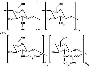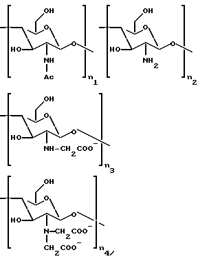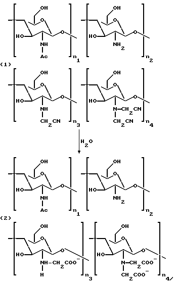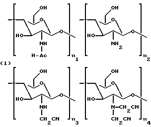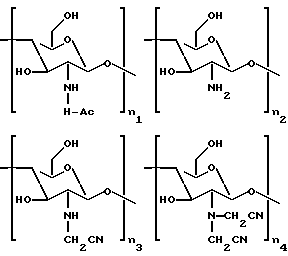 (57) Реферат: Изобретение касается новых N-цианометилированных хитозанов формулы 1, где степень полимеризации (x) равняется 5-10000, предпочтительно 20-500, n1 равняется 0-0,6, предпочтительно 0,05-0,20 части, в расчете на x; n2 равняется 0-0,20, предпочтительно 0,05-0,10 части, в расчете на x; n3+n4 равняется 0,4-1,0, предпочтительно 0,8-0,95 части, в расчете на x; продуктов их гидролиза, а также процессов получения этих соединений и применения. Цианометилированные хитозаны, в особенности продукты их гидролиза обнаруживают многостороннюю полезность как разделяющие мембраны, комплексообразующие агенты, ингибиторы образования твердых отложений, стабилизаторы отбеливающих растворов, влагоудержатели в косметических композициях, загустители и репелленты. 5 с. и 1 з.п.ф-лы, 6 табл.