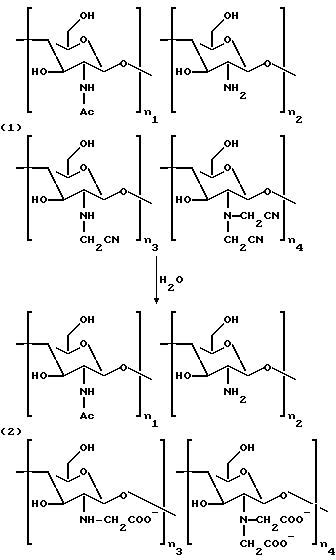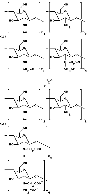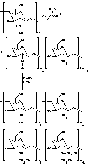 Настоящее изобретение касается N-цианометилированных хитозанов, продуктов гидролиза вышеуказанных N-цианометилированных хитозанов, их получения и применения. Указанные N-цианометилированные хитозаны могут найти применение в качестве разделяющих мембран, а продукты гидролиза указанных N-цианометилированных хитозанов могут найти применение в качестве загустителей, репеллентов, секвестрантов, комплексообразующих веществ, ингибиторов образования твердых отложений, стабилизаторов отбеливающих растворов и для удержания влаги в косметических композициях. Известен хитозан, который получают деацетилированием хитина, встречающегося в природе поли-(N-ацетилглюкозамина). Хитозан нерастворим в нейтральной и щелочной средах. Однако, благодаря своему химическому строению в кислой среде он образует растворимые соли с определенными органическими и неорганическими кислотами. В основу изобретения положена задача получения новых производных хитозана – N-цианометилированных хитозанов, а также продуктов их гидролиза, обладающих рядом ценных свойств (пленкообразующие, связывающие, влагоудерживающие свойства и др. ), благодаря которым указанные вещества могут найти широкое применение в качестве загустителей, репеллентов, стабилизаторов отбеливающих растворов, для удержания влаги в косметических композициях и другое. Задача решена тем, что, согласно изобретению, заявляемый N-цианометилированный хитозан, содержит элементарные звенья формулы (1) ![]() где степень полимеризации (x) равняется 5-10000, предпочтительно 20-500, n1 равняется 0-0,6, предпочтительно 0,05-0,20 части, основываясь на значении x (в расчете на x); n2 равняется 0-0,20, предпочтительно 0,05-0,10 части, в расчете на x; (n3 + n4) равняется 0,4-1,0, предпочтительно 0,8-0,95 части, в расчете на z. N-цианометилированные хитозаны – это полимеры, обладающие пленкообразующими свойствами. Они образуют прочные, механически и химически стойкие пленки в растворах, содержащих муравьиную кислоту. Поэтому они могут быть особенно полезны для приготовления разделяющих мембран высшей прочности. Способ получения N-цианометилированного хитозана, согласно изобретению, включает взаимодействие хитозана с формальдегидом и цианидом водорода в интервале температур от 10 до 70oC и при времени реакции от 0,5 до 12 часов, предпочтительно от 2 до 5 часов, в соответствии со следующей схемой реакции: ![]() где степень полимеризации x равняется 5-10000, предпочтительно 20-500; n1 равняется 0-0,6, предпочтительно 0,05-0,2 части, в расчете на x; n2 равняется 0-0,20, предпочтительно 0,05-0,1 части, в расчете на x; (n3 + n4) равняется 0,4-1,0, предпочтительно 0,8-0,95 части, в расчете на x. Предпочтительно реакцию проводят в присутствии муравьиной кислоты. Изобретением также является гидролизованный N-цианометилированный хитозан, содержащий элементарные звенья формулы (2): ![]() где степень полимеризации x равняется 5-10000, предпочтительно 20-500; n1 равняется 0-0,6, предпочтительно 0,05-0,20 части, в расчете на x; n2 равняется 0,01-0,20, предпочтительно 0,05-0,10 части, в расчете на x; (n3 + n4) равняется 0,4-1,0, предпочтительно 0,8-0,95 части, в расчете на x. Способ получения гидролизованного N-цианометилированного хитозана, согласно изобретению, включает гидролиз N-цианометилированного хитозана формулы (1) в соответствии со следующей схемой: ![]() где степень полимеризации x равняется 5-10000, предпочтительно 20-500; n1 ра
